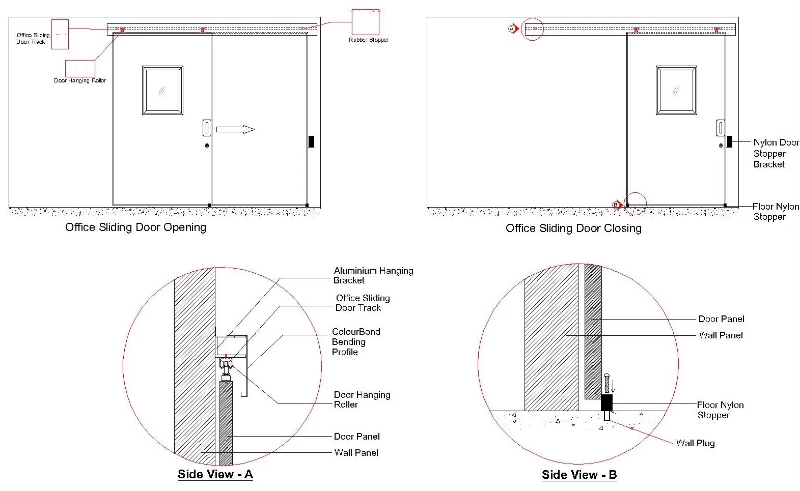 Description Description OFFICE SLIDING DOOR. Specification : – Office Sliding Door Size can be customized upon customer request. Cladding with ColorBond 0.5mm PPGI or Stainless Steel 3042B with PU Foam, with Density of 45kg/m3. With Door Thickness of 31mm With using Man-Power to Open Door [Manual]. Suitable in Commercial Building, Production Room, Ant Room, Clean Room & Office PRODUCTS GALLERY